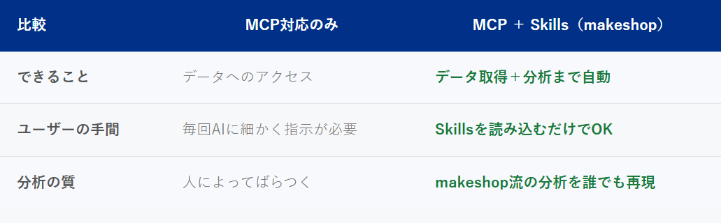 あわせて、接続環境の提供にとどまらず、「makeshop byGMO」のEC運営ノウハウをAIに組み込むための「Skills」も、同時に配布予定です。これにより、AIエージェントと自社ECのデータを接続するだけで、実践的なEC分析をすぐに活用できる環境を実現します。