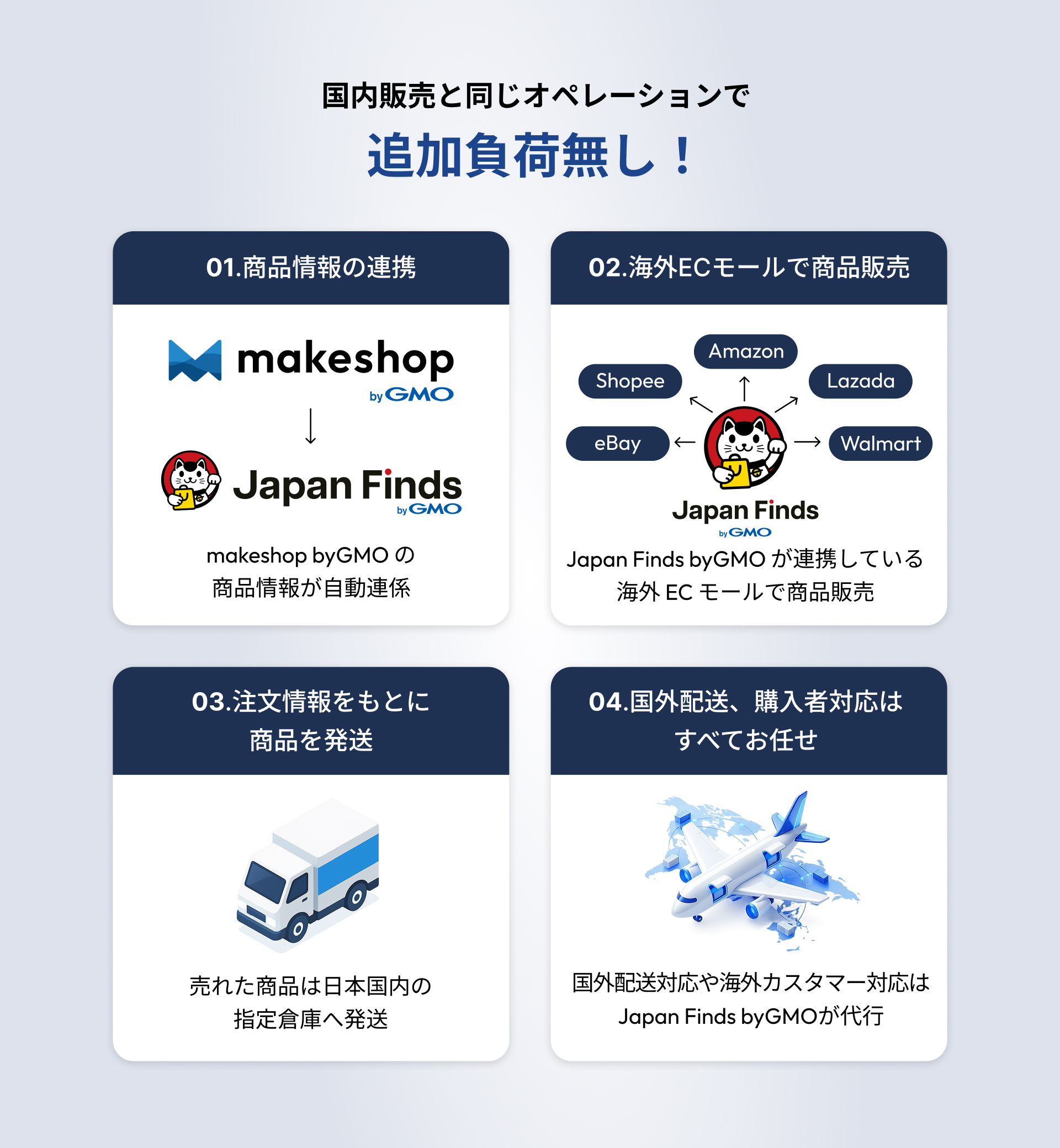 「Japan Finds byGMO」は、eBayをはじめとした海外主要ECモールに対し、自社ECサイトで扱う商品を出品できる越境EC支援サービスです。商品情報の登録、多言語翻訳、決済処理、受注管理、国際配送までをワンストップで提供し、海外販売に必要な煩雑な工程を包括的に支援します。「makeshop byGMO」を利用するEC事業者は、「申し込み・審査」→「商品連携」→「注文情報をもとに国内倉庫に商品を納品」の3ステップで海外販売を開始でき、面倒な輸出手続きや海外顧客対応はすべて本サービスが代行します。